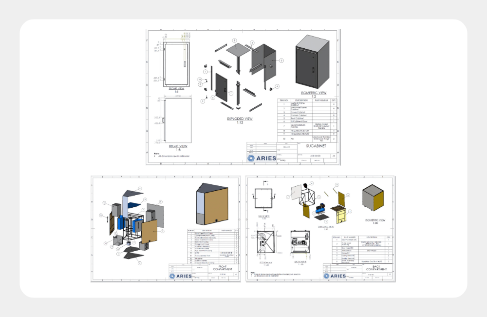Production ready 2D drawings with BOMs, dimensions, and tolerances.